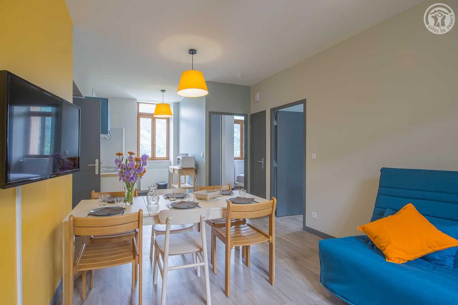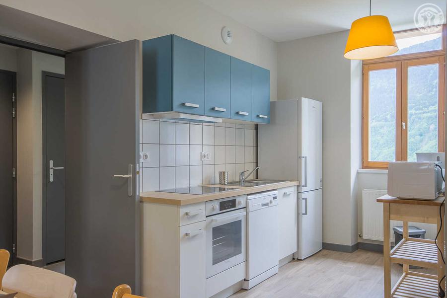 This village school now includes the town hall and 2 cottages. On the road to a mythical high pass and 3 km from a resort linking the Sybelles ski area, this village is an ideal starting point for skiing or hiking. The 2 cottages on the same floor are functional and decorated in a palette of bright and tonic colors. The 2 cottages can be rented together to accommodate a total of 12 people. The common room is extra (direct rental with the Town Hall)