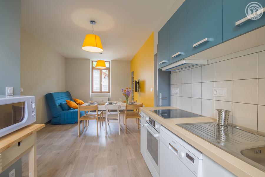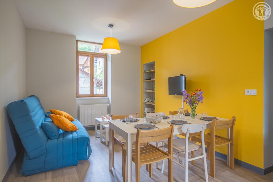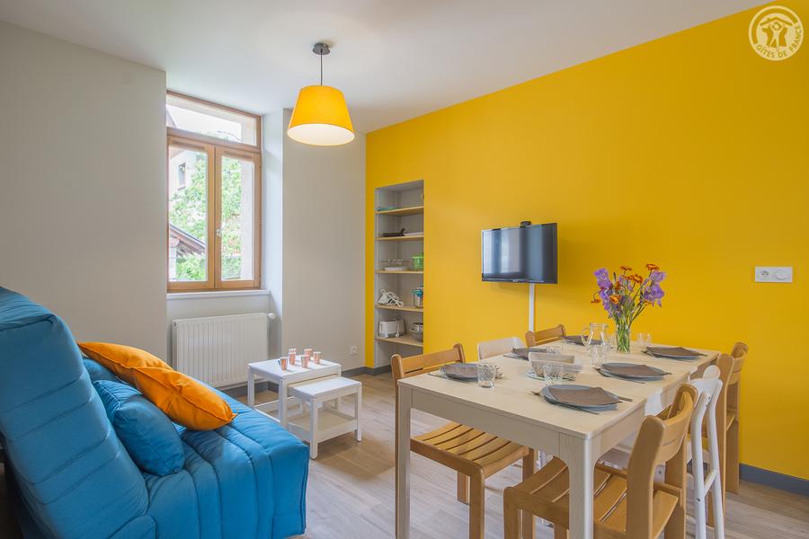 In the heart of a mountain village, a remarkable renovation of 2 communal gites, a very beautiful, colorful success! Note the little "Plus", a large common room with kitchen, on the ground floor, to meet up with family or friends, for a weekend or more.