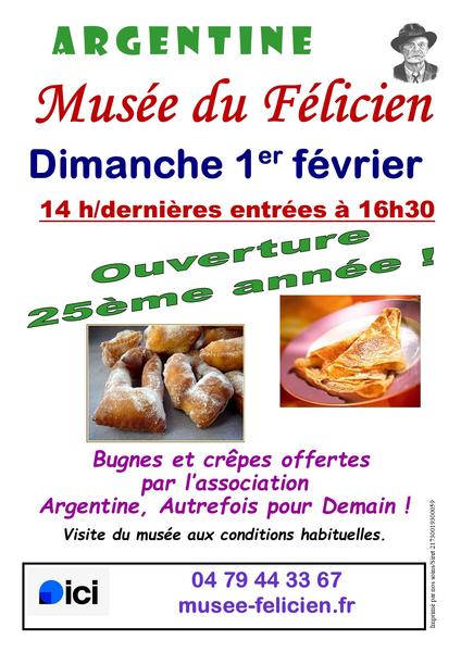 Le Musée du Félicien réouvre ses portes pour sa 25ème année. A cette occasion l'Association Argentine, Autrefois pour Demain vous offre bugnes et crêpes. L'occasion de découvrir ou re-découvrir votre patrimoine local!