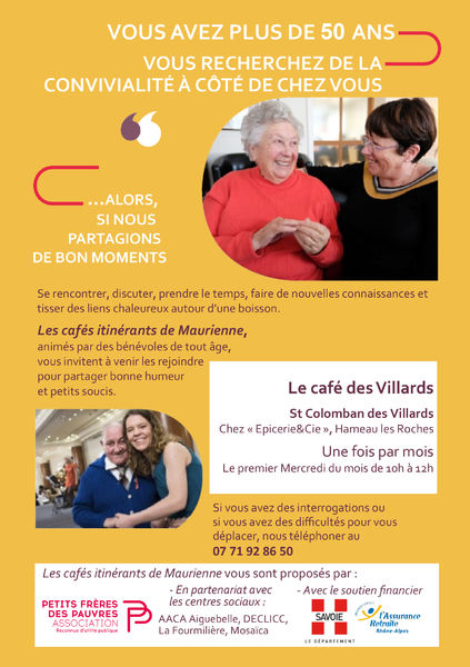 Les cafés itinérants de Maurienne vous sont proposés par les Petits Frères des Pauvres en partenariat avec les centres sociaux AACA Aiguebelle, Declicc, La Fourmilière, Mosaïca et avec le soutien financier du Département et de l'Assurance Retraite.