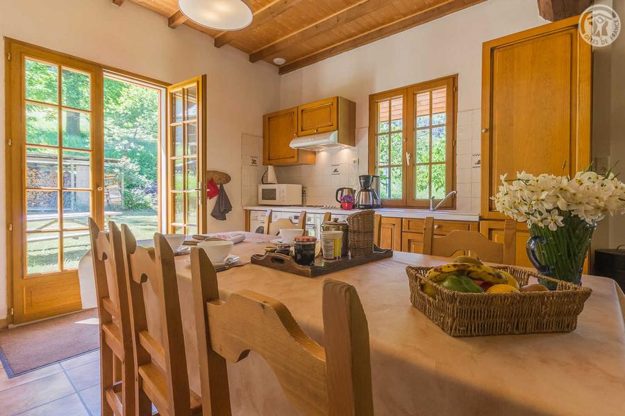 Chalet indépendant sur 2 étages. Accès par un escalier extérieur depuis le parking ou de plan-pied depuis le jardin. Au rez-de-jardin : pièce de vie (cuisine-séjour-salon) avec accès terrasse, 2 chambres (1 lit 2 personnes 160 x 200 cm / 2 lits 1 personne), 1 salle d'eau (douche) et un WC indépendant. A l'étage, 3 chambres (1 chambre 4 lits 1 personne, 1 chambre 3 lits 1 personne et 1 chambre 2 lits 1 personne), 1 salle d'eau (douche) avec WC. Jardin naturel non clos. Parking aux abords de la maison. Garage accessible pour le rangement des skis et des vélos. Draps et linge de toilette inclus.